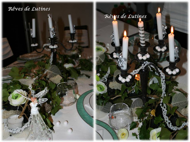 Au centre de la table trônait un candélabre en fer forgé. 5 bougies blanches apportait une douce clarté une fois allumées. De leur promontoire, nos anges argent veillaient sur nos convives.