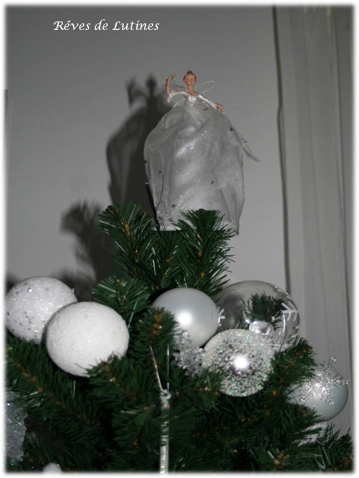 Au sommet : une fée de la nature dans ses plus beaux atours trônent en son sommet. Sa robe lamée blanche scintille d'étoiles argentées.